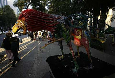 An alebrije is seen on Reforma avenue during an exhibition called "The Night of the Alebrijes" by The Museum of Folk Art (MAP) in Mexico City October 31, 2008. Alebrijes, which sometimes have detachable parts like wings, flowers or feathers, are colourfully painted creatures made of wood that originate from Oaxaca.
